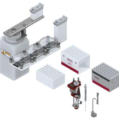 If needed, the MPS injects various solvents into the pipette tip in order to perform subsequent steps. A new pipette tip is used for each new sample. The DPX steps can be incorporated within the automated sample preparation process using the MPS immediately before injection.