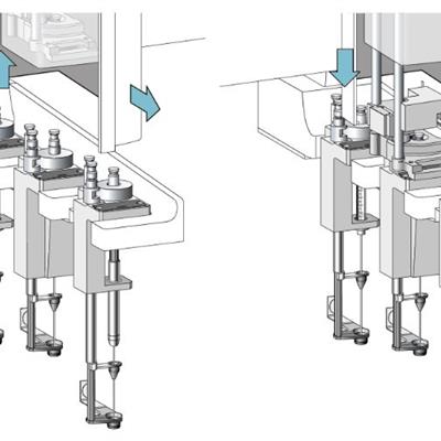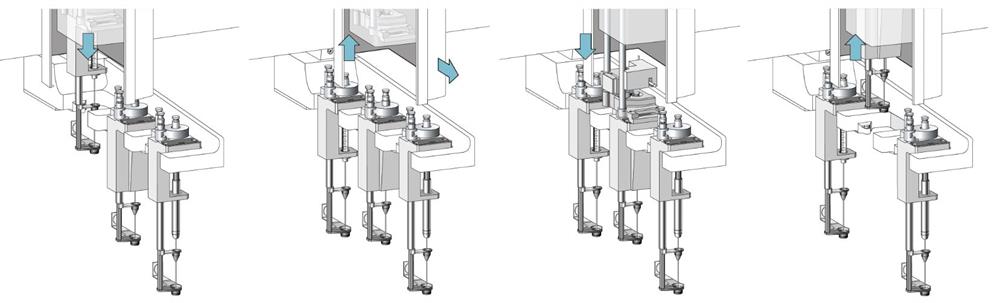 Chaque étape d’un protocole de préparation d’échantillon nécessite un outil différent afin que la méthode soit optimisée. Il faut par exemple une seringue pour une étape de dilution et un outil spécifique pour l’injection en ligne sur un système LC-MS. Le PAL RTC permet de basculer d’un outil à l’autre automatiquement sans intervention de l’utilisateur.