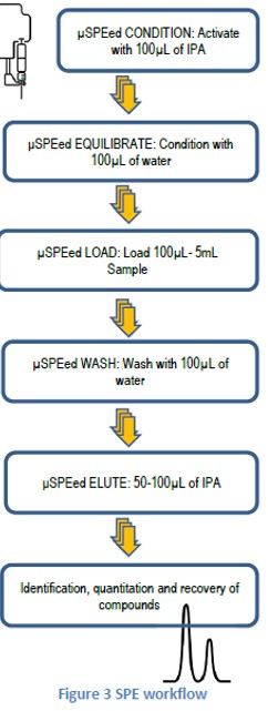 Les échantillons aqueux ont été chargés sur des cartouches μSPEed, C18RPS-3μm/120Å (ePrep), lavés à l’eau ultrapure puis élués avec 50-100 μL d’IPA. Les étapes de conditionnement et d’équilibrage ont été effectuées à un débit de 200 μL/min, toutes les autres étapes à 60 μL/min. Le flux opérationnel est décrit ci-contre.