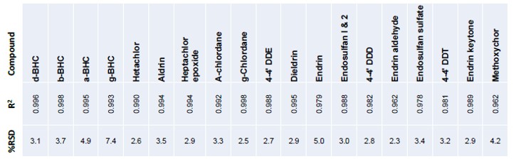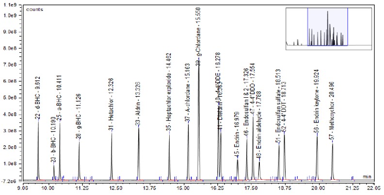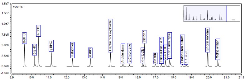 Une solution standard à 50 ppb contenant vingt pesticides différents a été utilisée pour l’étalonnage. Chaque composé a été identifié à partir de 3 ions majeurs et comparé aux spectres de référence de la bibliothèque. La quantification s’est basée sur l’abondance de l’ion le plus courant.
