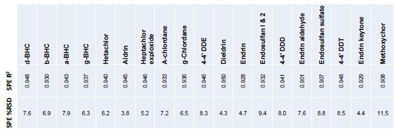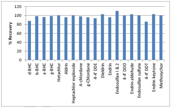 Le rendement a été étudié en déterminant un standard enrichi dans un échantillon d’eau ultrapure (50 ppb pour chaque pesticide) ; la plage de récupération était de 86 à 103 %, démontrant que cette méthode SPE offre une bonne sélectivité et une adéquation pour l’analyse des pesticides dans les échantillons d’eau.