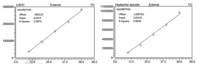 Les résultats sont résumés dans le tableau 1 et des exemples de courbes d’étalonnage pour 2 composés (époxyde d’heptachlore et b-BHC) sont présentés en figure 2.