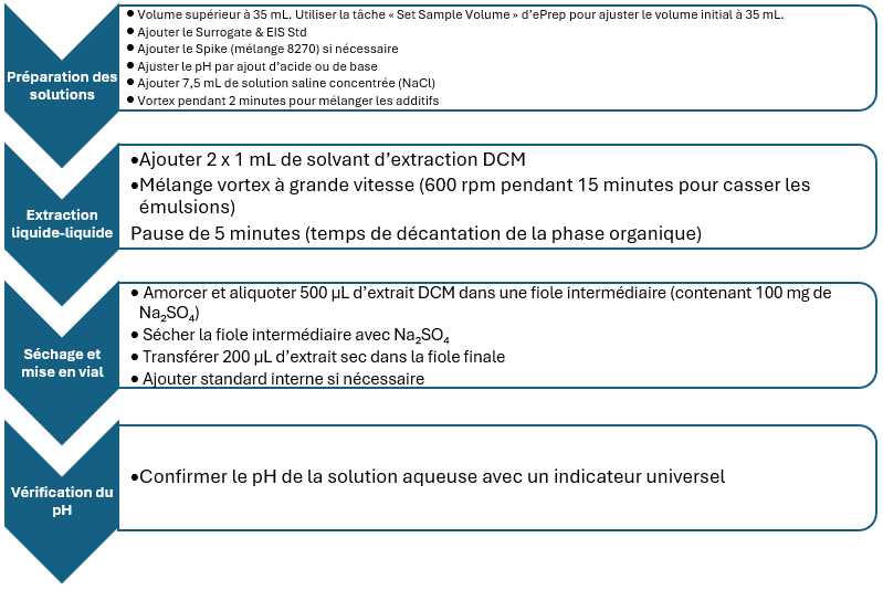Le flux de travail intègre l’extraction liquide-liquide automatisée d’ePrep, utilisant des seringues analytiques pour créer des gouttelettes de phase organique microscopiques dans la phase aqueuse. Le Workflow ePrep automatise l’ensemble du processus :