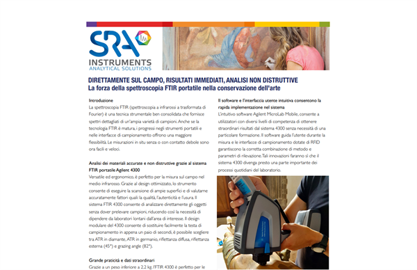Analisi dei materiali accurate e non distruttive, grazie al sistema FTIR portatile Agilent 4300; versatile ed ergonomico è lo strumento perfetto per la misura sul campo nel medio infrarosso. Il design ottimizzato consente di eseguire la scansione di ampie superfici e di valutarne accuratamente fattori quali: qualità, autenticità e usura.