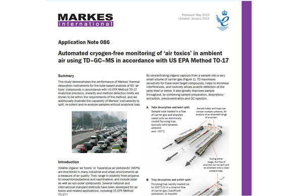Questa nota applicativa illustra le prestazioni degli strumenti di desorbimento termico Markes per l'analisi in provetta di 65 composti "tossici nell'aria" in conformità al metodo US EPA TO-17.